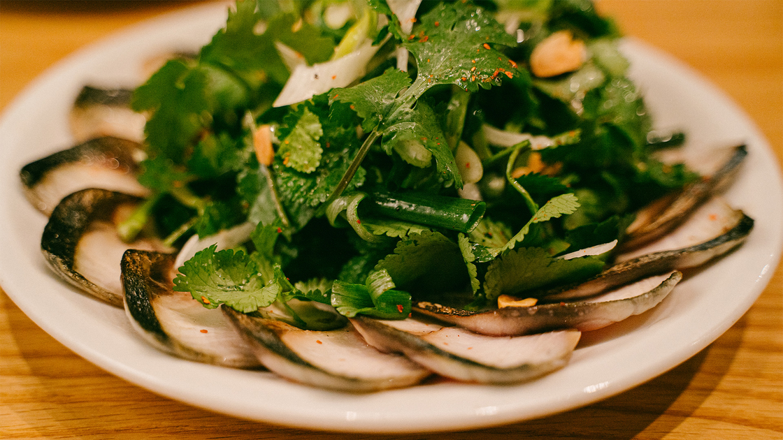 ネギは2種類の異なる切り方をすることで、違った食感が楽しめます。牛骨、スルメ、シナモン、エシャロット、ブラウンカルダモンなど10種類以上の具材を入れ、8時間以上煮込んだ牛骨スープは体に染み渡るおいしさ!
